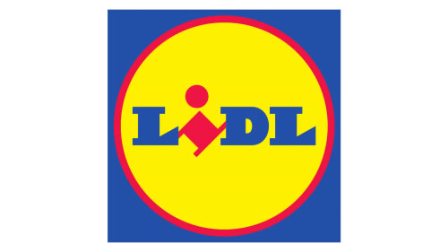 L`emblème Lidl est un carré bleu doté d’un cercle jaune avec une bordure rouge. Le nom « Lidl » est à l’intérieur du cercle. 3 lettres du nom sont en bleu, et la lettre « I » est en rouge. La lettre « I » est montrée comme une personne, qui fait des achats.